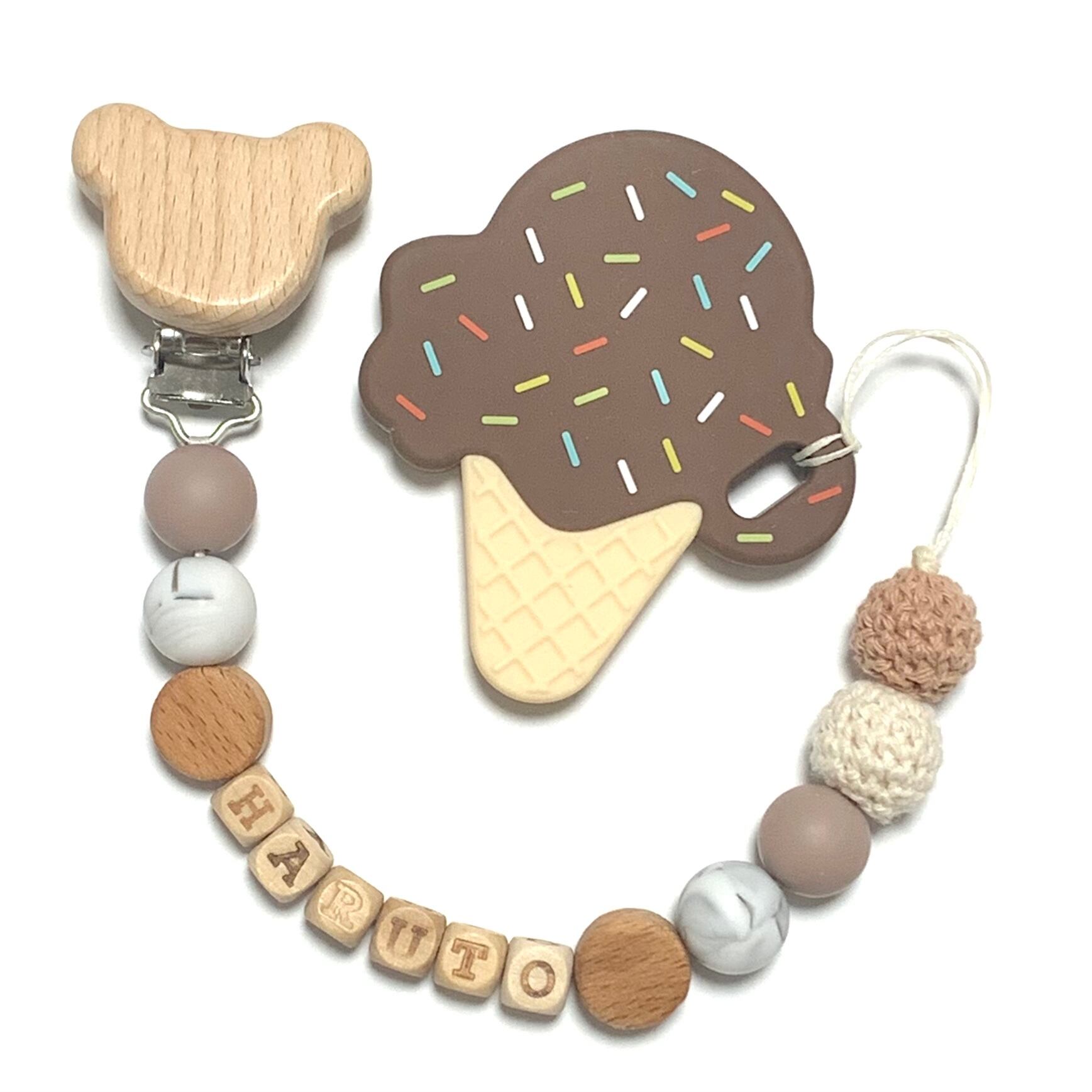 口に入れても大丈夫なよう米国食品医学薬品検査適合商品のシリコンビーズを使用しております!木材パーツは無塗装のブナ材、メープル材を使用しておりますので安心してお使い頂けます。